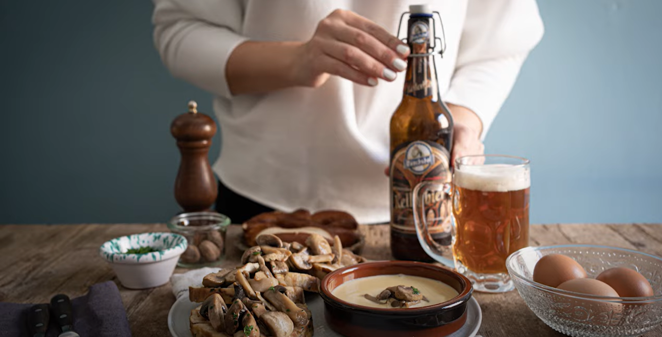Breznknödel-Carpaccio con fonduta di Tilsiter e funghi trifolati