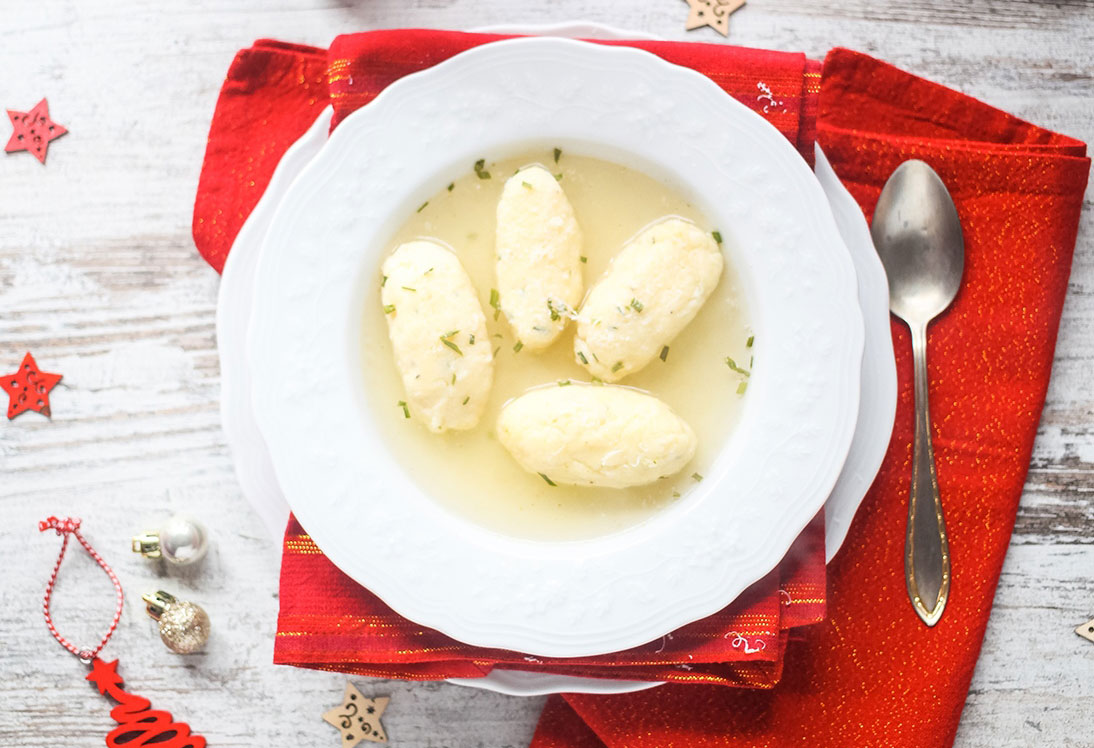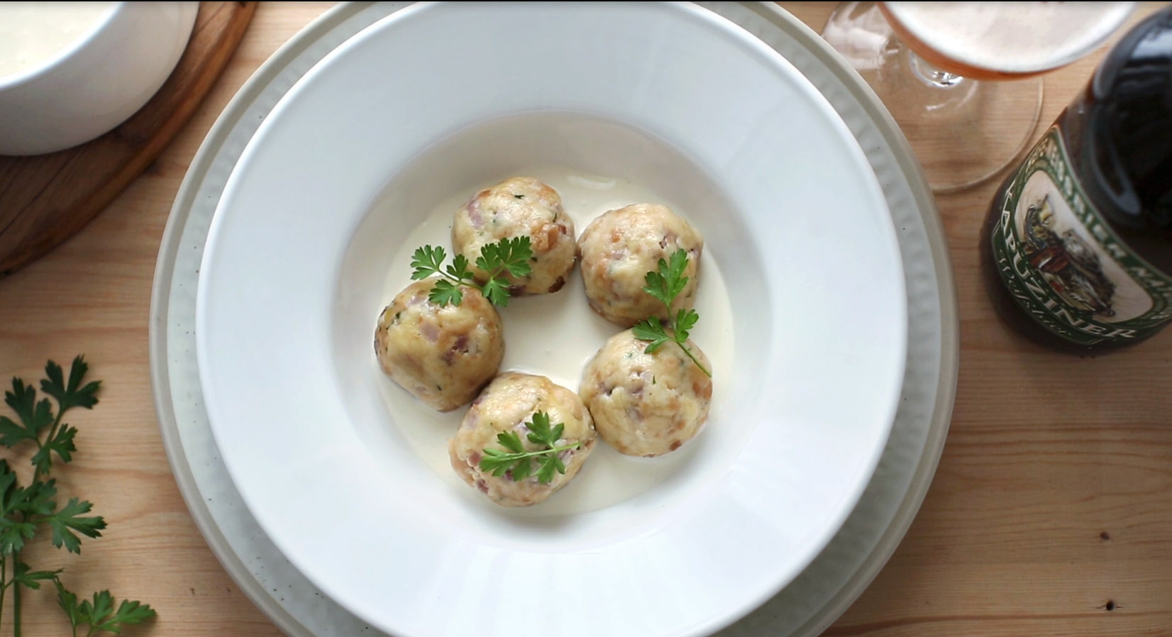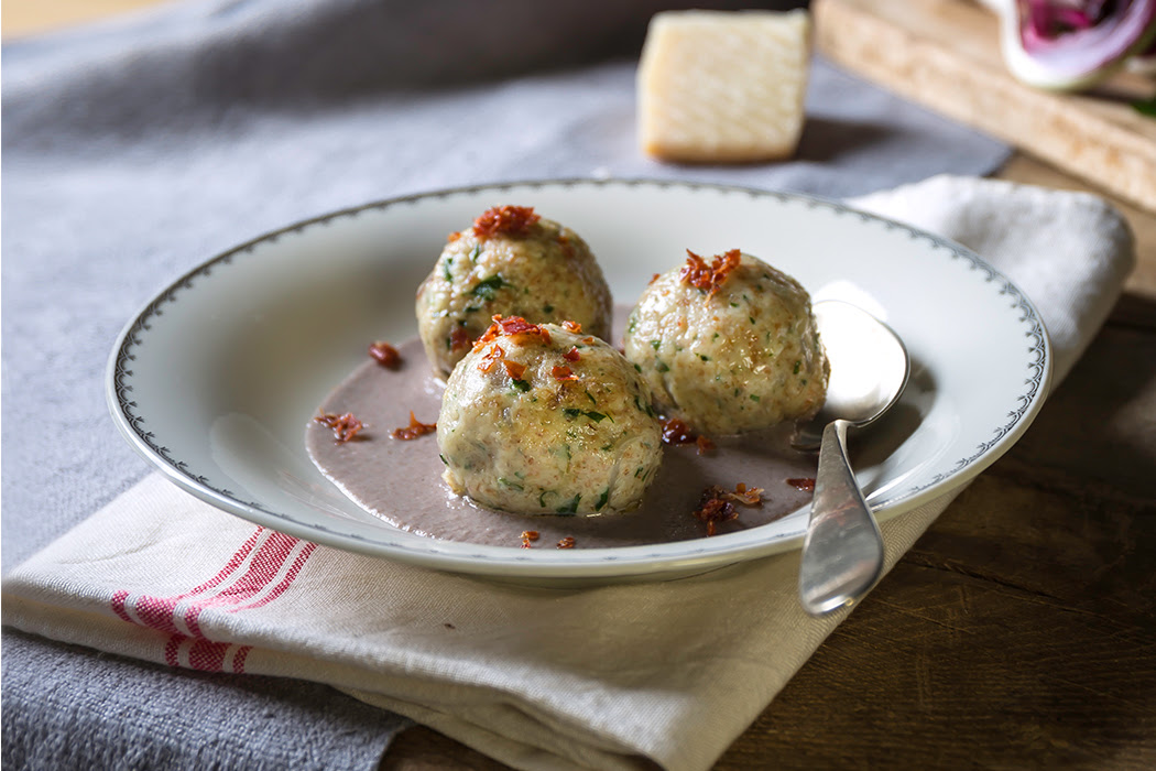 Rahmschwammerl mit Semmelknödel (Canederli con mortadella e crema di funghi)