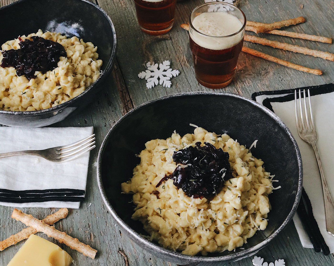 Spätzle alla barbabietola con burro aromatizzato alle erbe